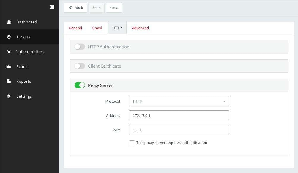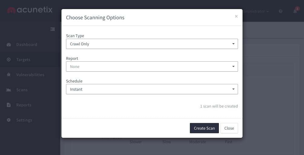 scan 按钮,按图示选择 Crawl Only 即仅使用爬虫,然后点击 Create Scan 就可以开始扫描了。