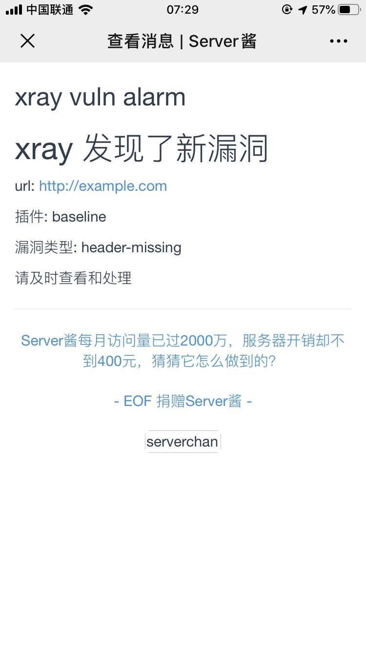 Server酱是一款程序员和服务器之间的通信软件,也就是从服务器推报警和日志到手机的工具。开通并使用上它还是很简单的很简单就收到了消息,将上面 xray 的漏洞信息结合在一起,就是展示效果如图